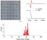 AFM探針の優れた空間分解能により、従来のプローブステーションでは到底不可能であった、微小な長さスケール(〜20 nm)での、絶縁破壊の局所的測定が可能